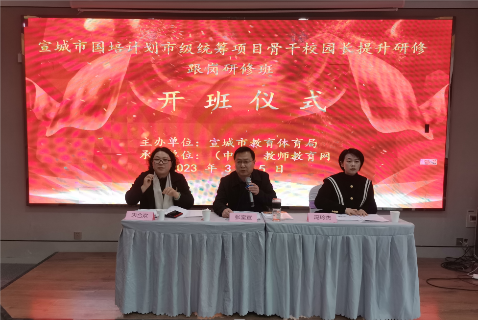 开班仪式由教师教育网宋合欢宋主任主持,宣城市教体局党委委员、副局长张堂宣张局长,宣城市教体局人事科科长冯玲杰冯科长出席讲话。
